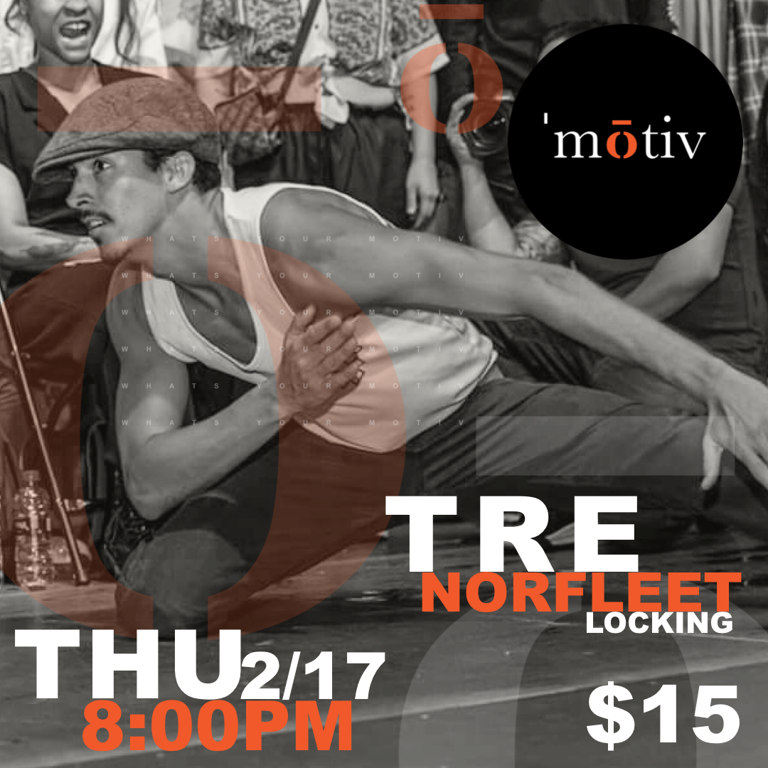 Feb 17 Tre Norfleet Locking Workshop Thursday, February 17, 2022 8:00 PM 9:30 PM Motiv Dance (map) Google Calendar ICS BOOK NOW View Event →